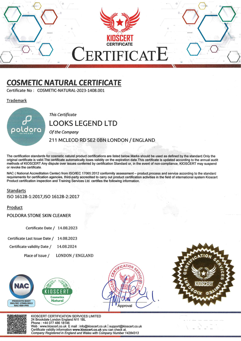 We proudly affirm that the quality and reliability of our products have been certified by various certifications that attest to compliance with international standards. Our IFC Cosmos Organic Certification and Kioscert Natural Cosmetic Certification underline the trustworthiness of Poldora's natural and organic products. Additionally, our ISO 9001 Quality Certificate documents the excellence in our production process and our continuous improvement efforts.